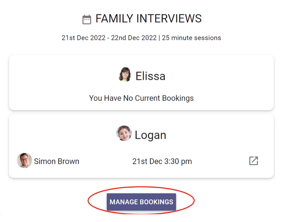 3. If a booking has been made by a staff member, the date and time of the booking will be displayed along with the staff member(s) you will be meeting. This information will remain available, after bookings have been closed to caregivers.
