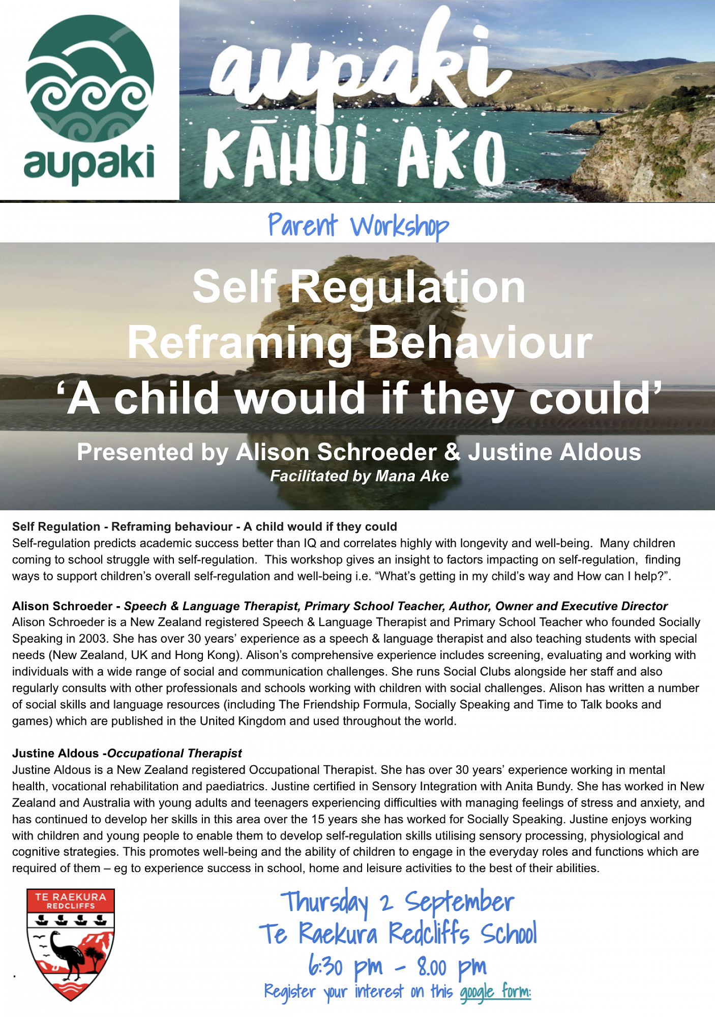 Aupaki Kahui Ako is excited to offer another workshop for parents with a focus on Self Regulation: Reframing Behaviour - 'A child would if they could'