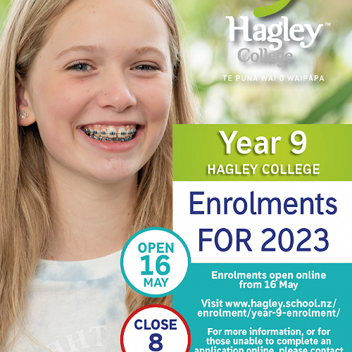 Visit this articleEnrolment applications for Hagley College Year 9 2023 close next week (Friday 8th July - the last day of Term 2).