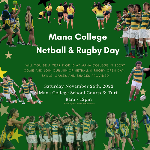Mana College is holding a Junior Netball & Rugby day for those students who will be year 9 or 10 at Mana College in 2023. No experience required.