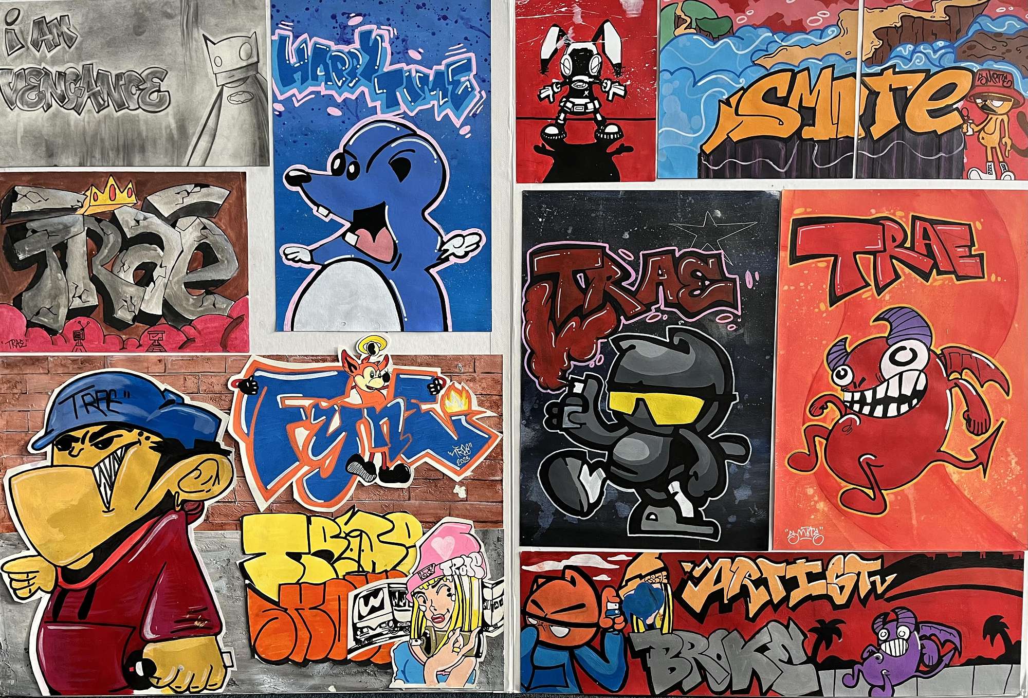 In fig two we see a folio submission painted by Tremaine Karaka exploring themes of graffiti and street art. This submission showcases the journey a graffiti artist acquiring skills and developing their style into something more involved. In the beginning we see lots of text heavy paintings (traditionally associated with graffiti) Tremaine then makes a smooth transition extending his ideas towards street art, through the inclusion of unique characters and new painting techniques. Ka pai Tremaine!