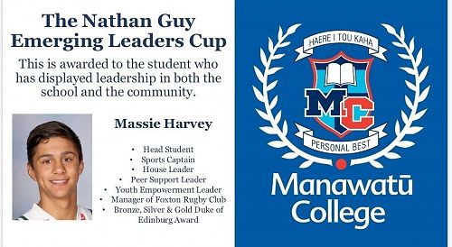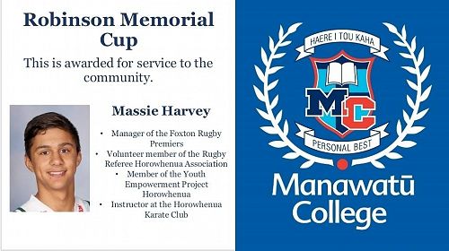 MASSIE HARVEY - Graduation Certificate, Morris House Leader, Head Student, Senior Boys Swimming (Mr M Bowes Cup), Basketball – Most Valuable Player (donated by E Tukapua)(shared with Saryah Chambers), 1st = in NCEA Level 3 Mathematics Cup (donated by the Healey family)(shared with Mallory Olsen), 1st = in NCEA Level 3 Physical Education Cup (shared with Saryah Chambers), Robinson Memorial Cup for Service to the Community and an Academic Award. He plans to attend Massey University in Palmerston North next year to study a degree in Business.