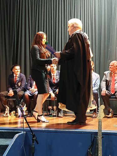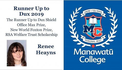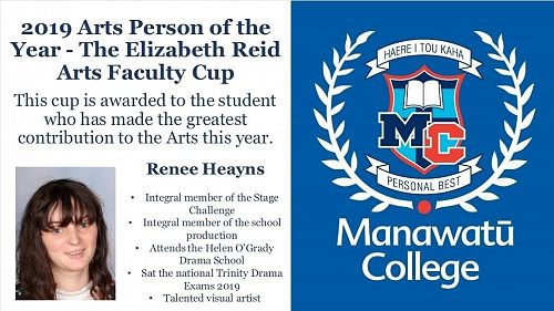 RENEE HEAYNS - Graduation Certificate, 1st in NCEA Level 3 Production Studies, 1st in NCEA Level 3 Media Studies Cup (donated by Mr A Wheatley), 1st in NCEA Level 3 Drama Cup, Stage Craft Cup (The Benge Cup) and an Academic Award. She plans to study Law and Theatre at Victoria University in Wellington next year.