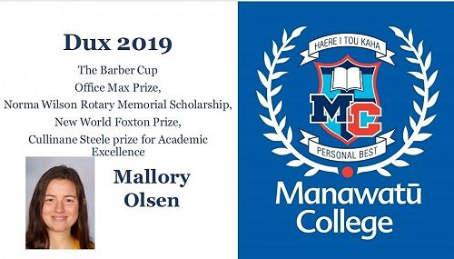 MALLORY OLSEN - Graduation Certificate, Morris House Leader, 1st = in NCEA Level 3 Food & Catering (shared with Tabitha Anderson), 1st in NCEA Level 3 Visual Art – Art Prize & PhotoLife Prize, 1st = in NCEA Level 3 Mathematics Cup (donated by the Healey family)(shared with Massie Harvey), 1st in NCEA Level 3 Financial Studies Cup (donated by the McErlean family), Business Studies Innovation – The Foxtel Cup and an Academic Award. She plans to attend UCOL in Palmerston North to study to become a Chef next year.