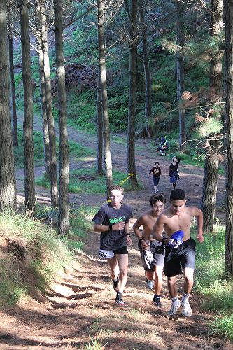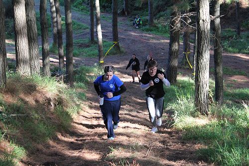 The 3.8km (all girls’ grades and the junior boys) and 4.8km (intermediate and senior boys) long courses are totally off-road, traversing several sand-hills covered in pine forest, with many flat stretches through scrub and cut-over pine.