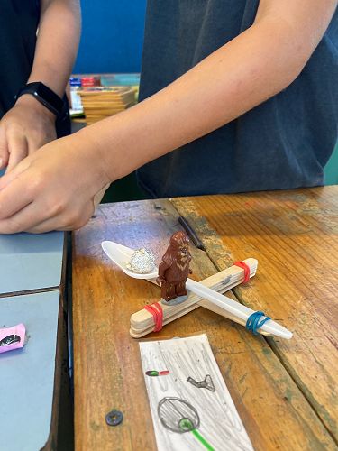 From a scientific point of view, catapults are cool devices that change potential energy into kinetic energy. Potential energy is energy that is stored. Think of the spring in a jack in the box before you open the lid - that spring has potential energy. Kinetic energy is used when an object moves. So when we push down on the plastic spoons, we’re creating potential energy. When we let the spoon go, the energy becomes kinetic energy and our little balls of tinfoil go flying!