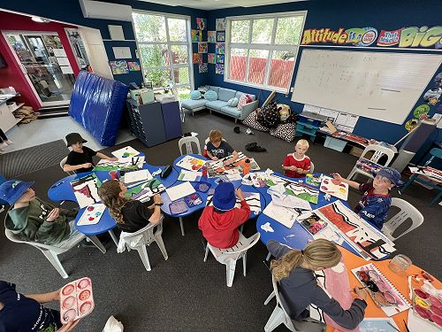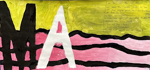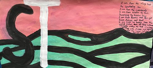 Then we experimented with line and contour by drawing the maunga in our immediate area from the view from our beautiful beach. This was transferred onto artworks which also had an “I AM” poem written in the style of George Ella Lyon. We learned to mix primary colours to create rich and varied secondary hues.