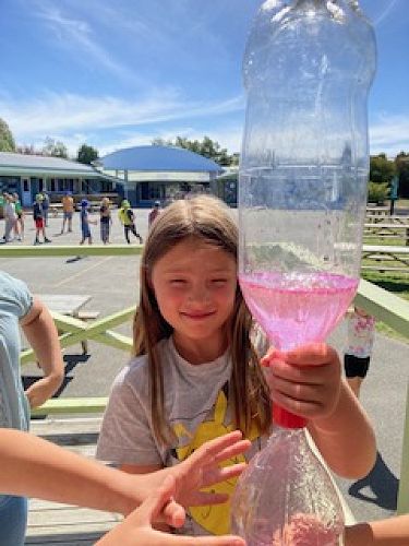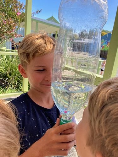 Some rather destructive spinning happens when tornadoes are created. Tornadoes occur when cold and warm air suddenly meet and create a spinning motion. Tornadoes travel at about 50 km an hour across land but inside the tornado the wind speed can get up to 500 kms an hour - scary! We then created Tornadoes is a bottle. Using a little ‘Tornado Tube’ we joined two Coke bottles together with water inside them. When we spun the bottle, the water would drain down into the other bottle. As it drained, the water spun like a tornado and created a hole in the middle called a ‘vortex’ which pulled the surrounding water into the middle of the bottle. Many of us had seen something like this before - it was in the bath when we pulled the plug!