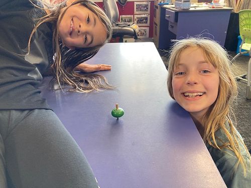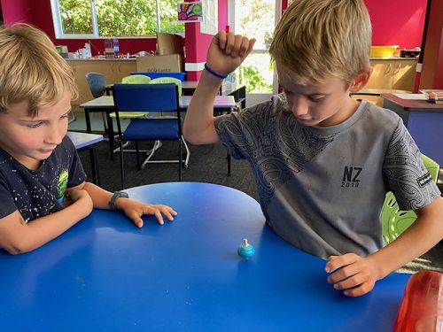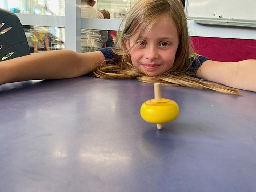 It was then time to play with our spinning tops which spin with a force called ‘torque’. There is also another force called friction which happens when two surfaces rub together. If you spin your top on a smooth surface there is less friction which means lots of spinning, that is, until gravity catches up. On a rough surface there is lots of friction on the spinning top - so it’s usually a short ride.