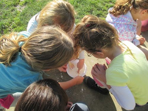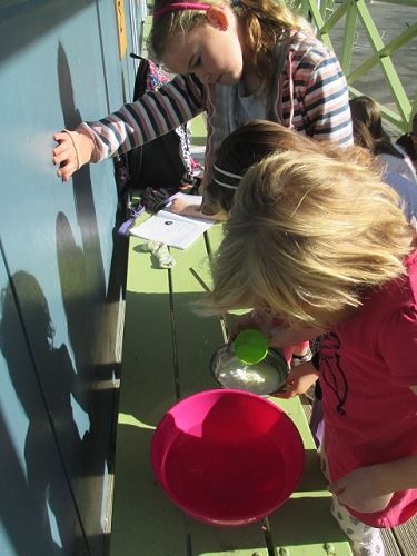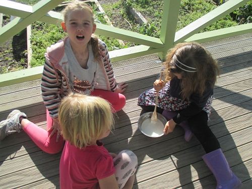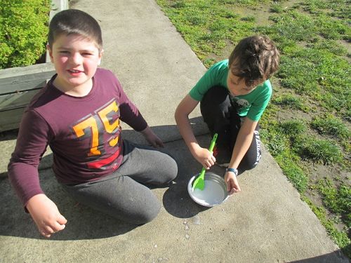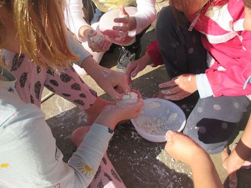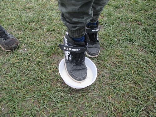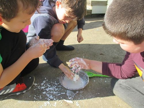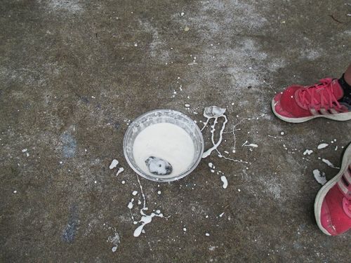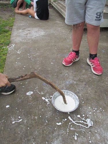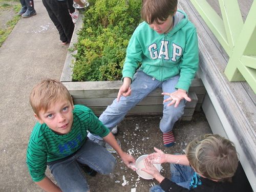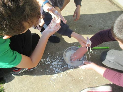 We discovered that corn flour particles do not dissolve in water but they do mix together. When we stood on the mixture/threw it/grabbed it or whacked it with a stick, it went hard. This is because the water gets squeezed away and the cornflour particles cling together. When we relaxed it the corn flour particles spread out and they mixed together again.
