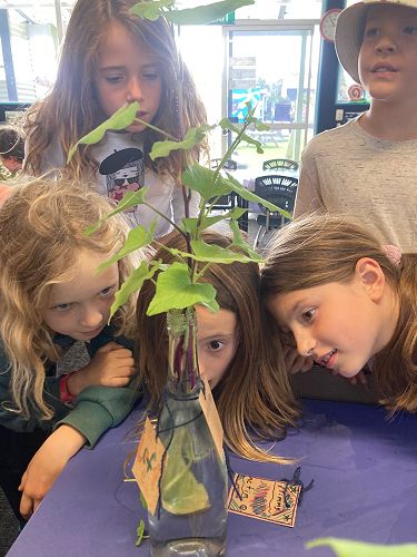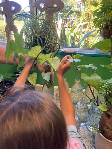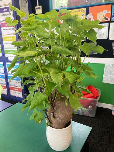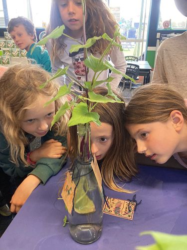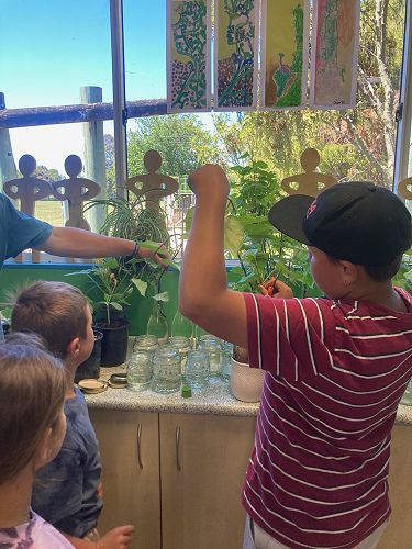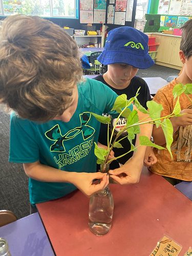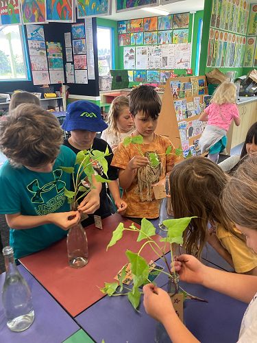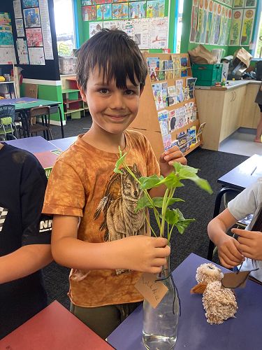 We have been busy in The Middles propagating kumara slips from Poppa Joe (our huge kumara from last year's harvest), and production has been prolific! He gets a hair cut once a week and the very next, he's ready for another. Next job was growing the roots of the kumara slips before planting, the tamariki watched with delight as they saw them grow through glass bottles with progress each day.