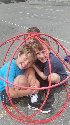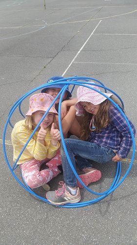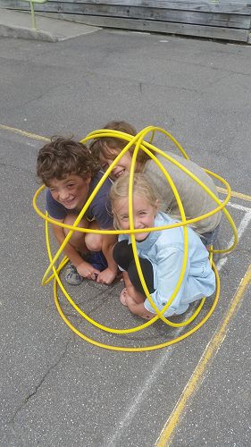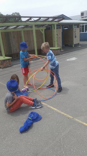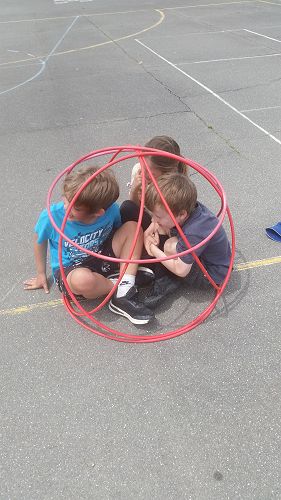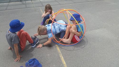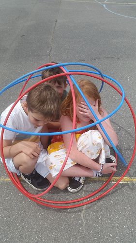 While working with Sporty Sue we learnt to work together to create huts using hula hoops.