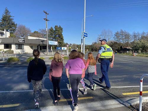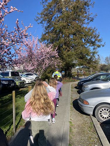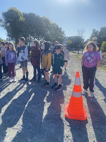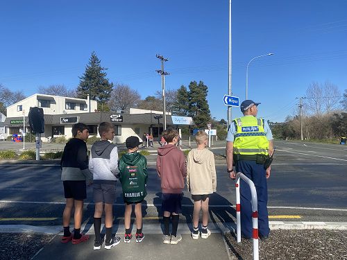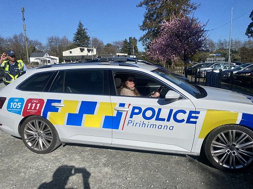 Our teacher Anna got to sit in the police car. She also got to start it, put it in reverse and back it up. She could not hear Constable Hamish because the radio was on too loud. We were trying to see if we could tell what lights meant what so if a car was in a driveway we could cross safely.