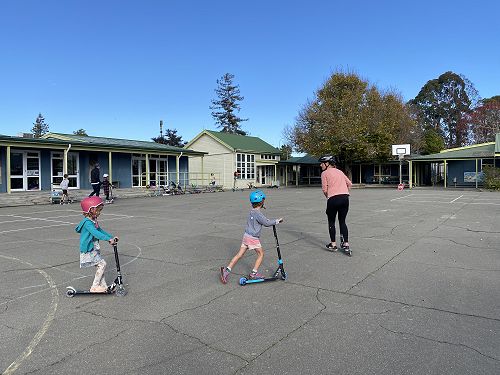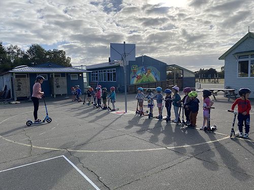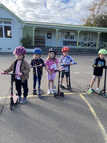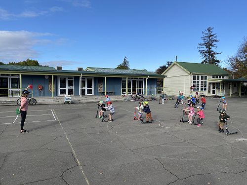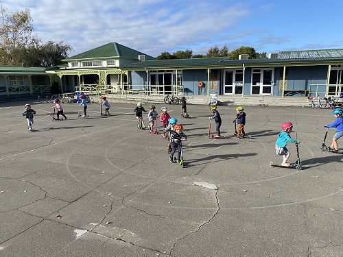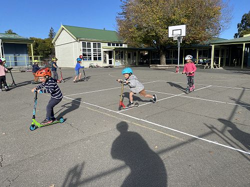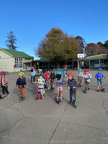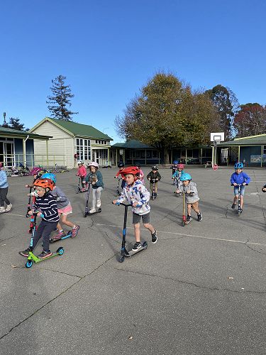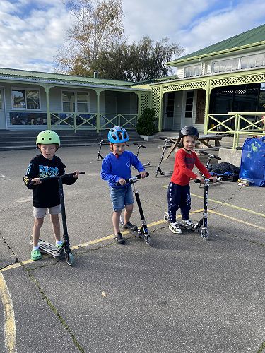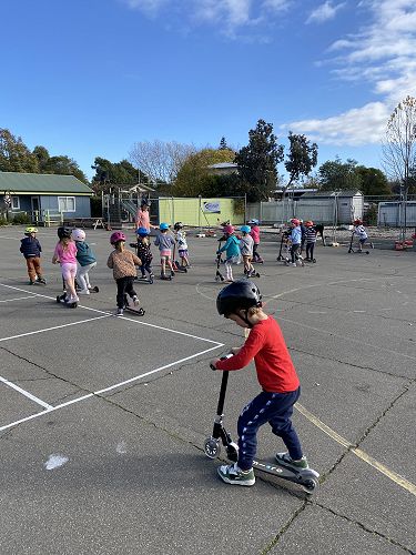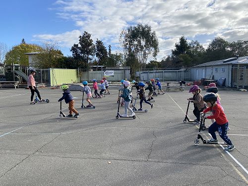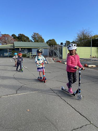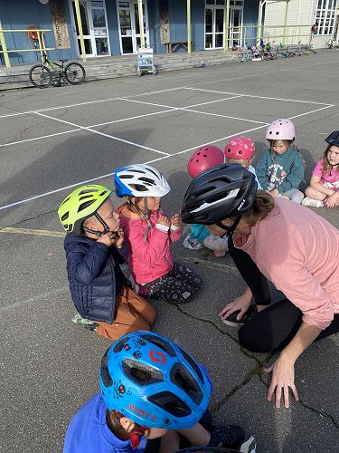 We made sure our helmets fitted correctly. This is super important as our brain is precious. We then learnt three ways to stop including the tap, tap, stomp, using the brake or the two foot dismount. We played some games like follow the leader and "What's the time Mr Wolf" to practise these moves.