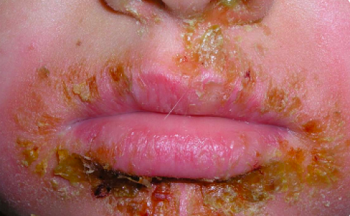 Impetigo (you say, im-pa-ty-go), also known as school sores.
