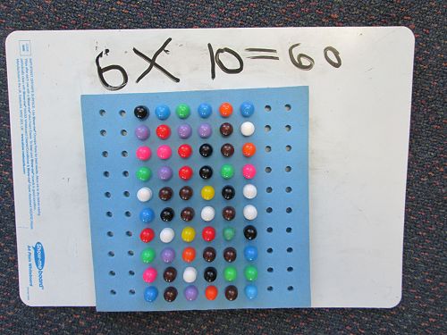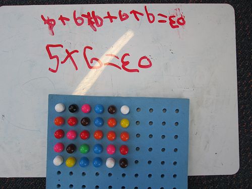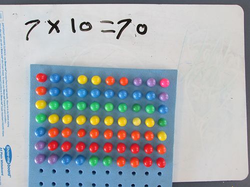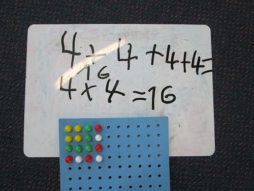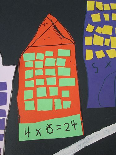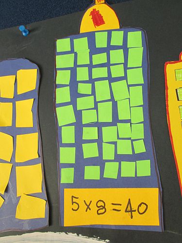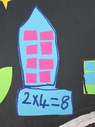 We realised that when we multiplied two numbers together we usually got a much bigger answer than when we added two numbers together. To help us get used to thinking about multiplication (or times-ing, as we like to call it) as making 'groups of' or 'lots of' we made a city of window-filled skyscrapers. The number of rows and number of columns that each skyscraper had represented the two numbers that we were multiplying. We then had to find the total by counting all the windows, or skip counting if we were really clever. We tried it with the peg boards too, and practised writing the equation that matched what we had created.