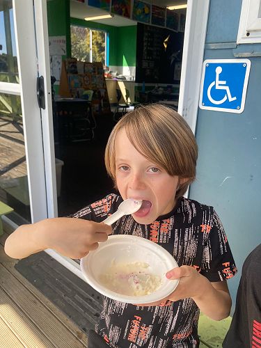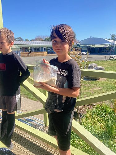 So ice cream in a bag - how did we make it? First we had one large and one small ziplock bag. In the small bag we added 3 heaped teaspoons of sugar and 1 and a bit teaspoons of vanilla essence for some flavour. Then we carefully poured into the small bag a cup of ‘Blue Top’ milk. We then sealed the small bag and put it in the big ziplock bag which had 3 cups of ice in it.