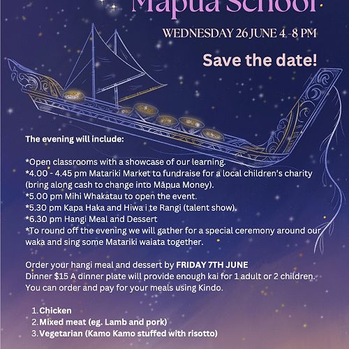 Visit this articleSave the date - Wednesday 26 June 4-8pm and come along to enjoy a wonderful evening with whānau at te kura o Māpua.
