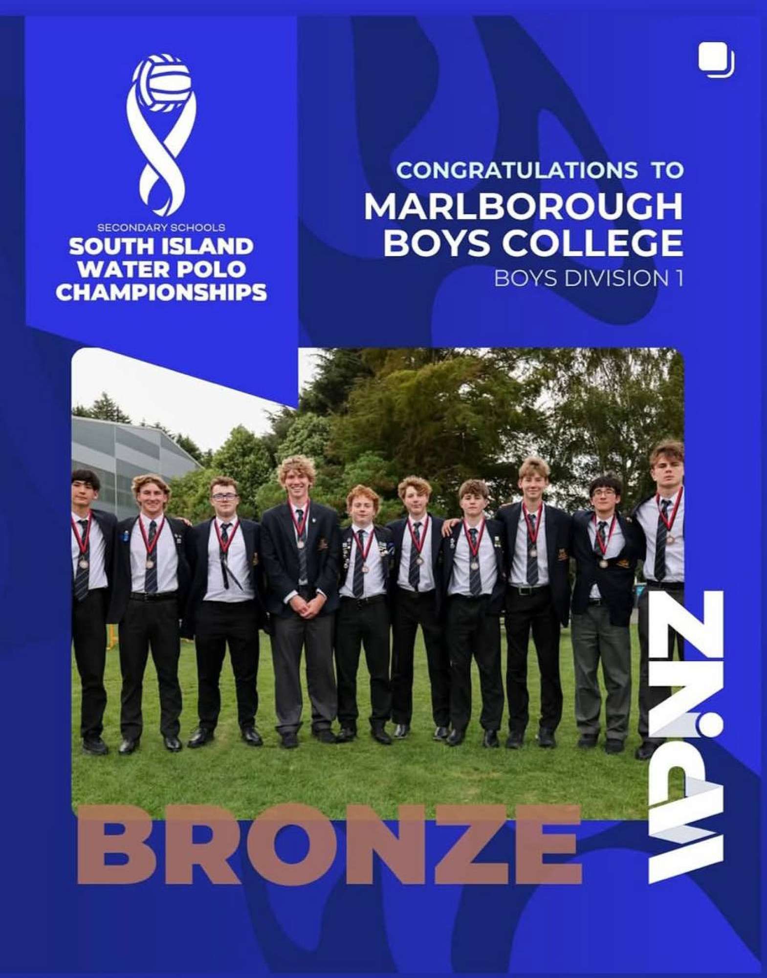 At the recent South Island Secondary School championships, our MBC Waterpolo team walked away with a Bronze medal after some hard fought games against some of the top schools. The team finished second in their group and played Kings College in their crossover beating them 13-6, this saw them play Christchurch Boys High in a semi-final. Unfortunately, the team couldn’t quite get up in that game and that saw them facing off against Christ’s in a 3rd/4th playoff. The team rose to the occasion and dispatched Christ’s 9-3. In addition to this fantastic team success, Scott Keay and George Adams were selected in the tournament team. Thank to Mr Mulcahy all of his work and time coaching the side and thank you to Mrs Yolande McIntyre and Mrs Emily McCallum for your support during the tournament.