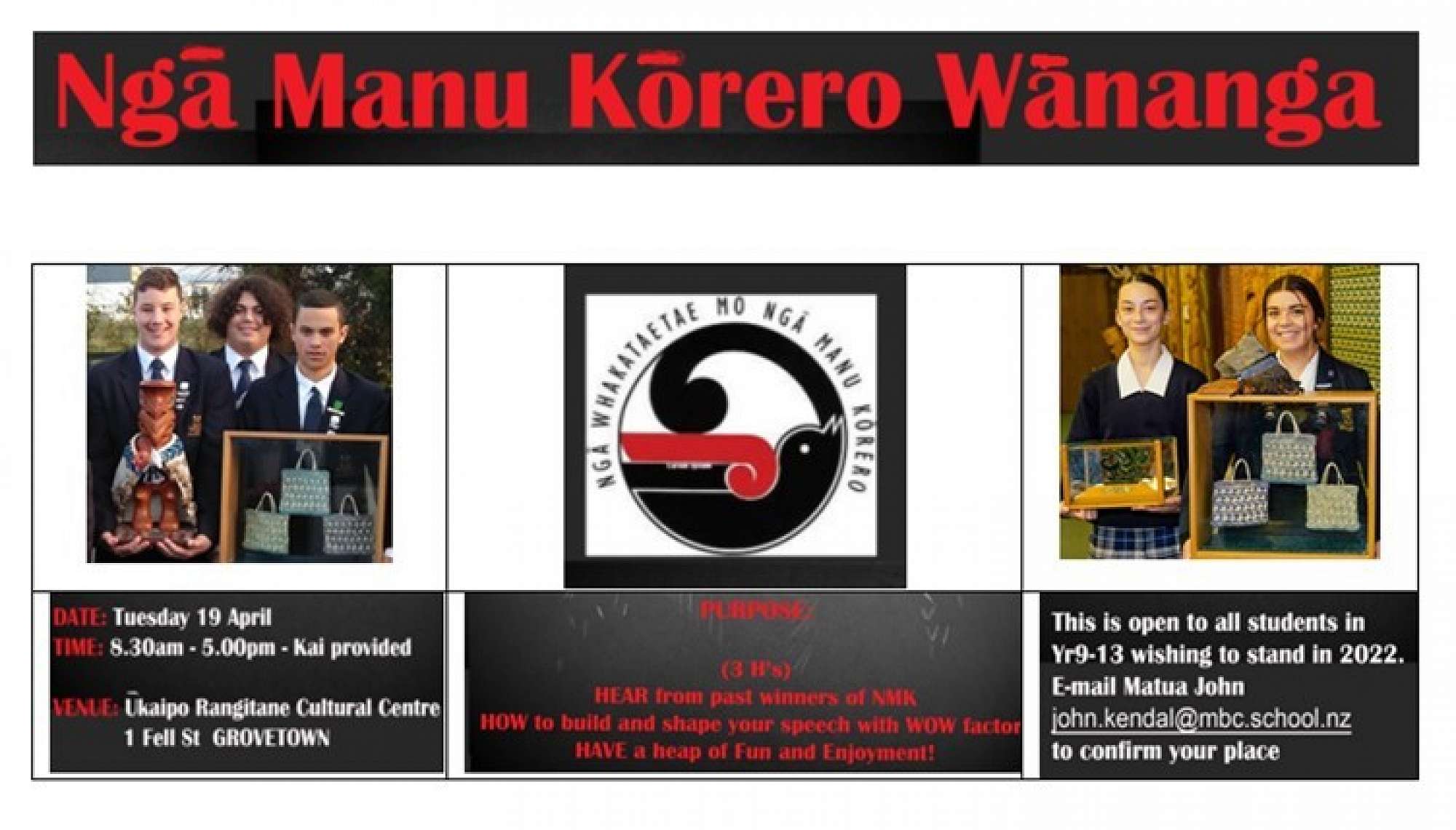 The Ngā Manu Kōrero Speech Competition has grown to be one of the most significant and most positive events for New Zealand secondary-school students, where competitors articulate their thoughts and aspirations in both Māori and English. The upcoming NMK Wānanga will be a great way for our students to shape and draft their speeches. They will also hear from past winners of this prestigious competition.