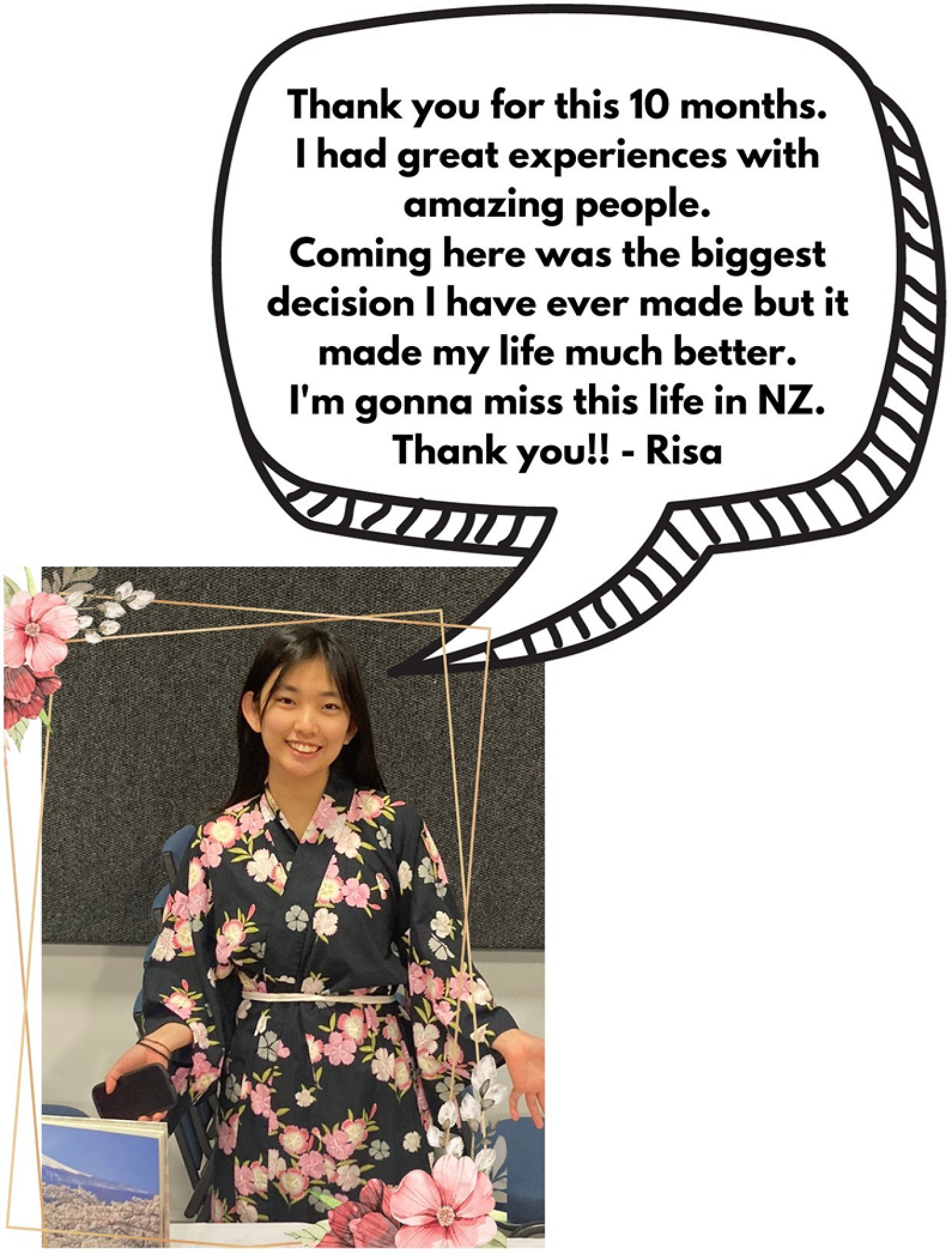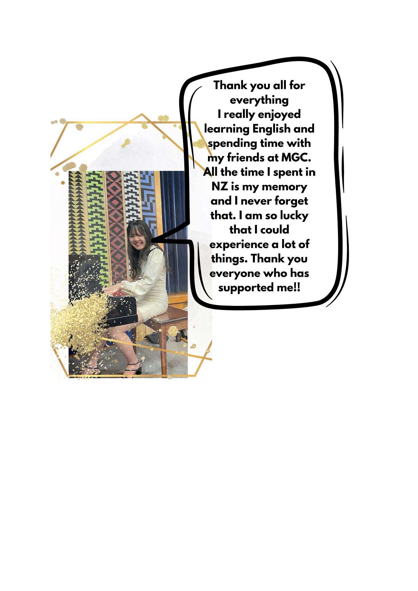 On 1 Nov 23, Risa and Hinoa, two international learners, said goodbye as the Seniors began their exam leave. We celebrated their journey this year and expressed our appreciation for being a part of our whānau. Their presence enriched our lives in countless ways, and we are proud of all that they have accomplished during their time here. As they prepare to say farewell to MGC, we want them to remember that they always have a special place in our hearts. We wish them every success and happiness on their journey home, and we hope our paths will cross again.