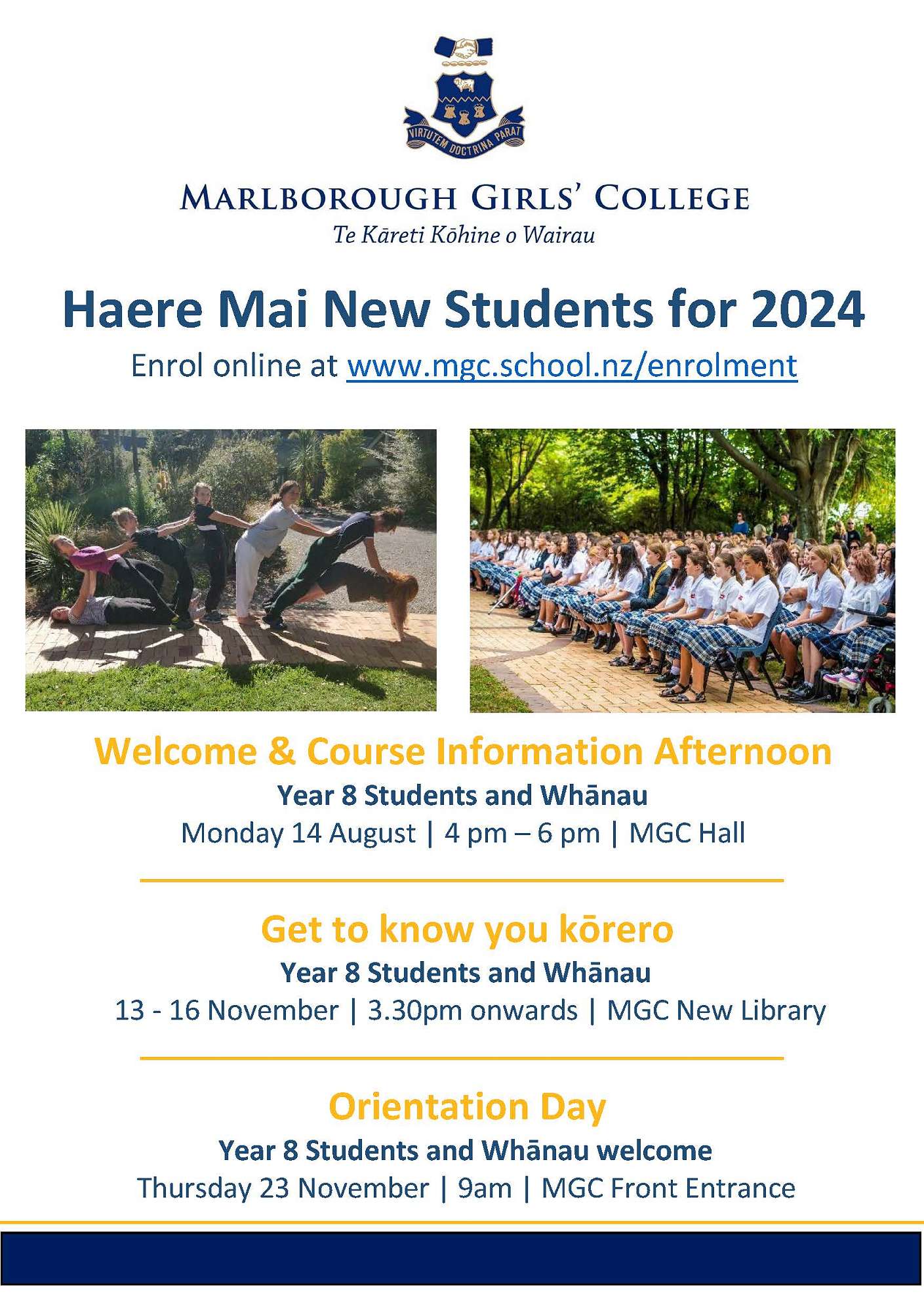 Photo by Marlborough Girls' College Haere Mai and Welcome to those joining us in 2024 Marlborough Girls' College — August 10th, 2023 www.mgc.school.nz/enrolment for more information Image by: Marlborough Girls' College Attachments Poster - Welcome New Students for 2024