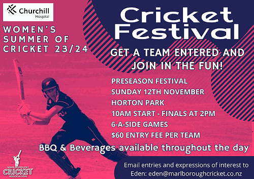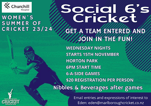 Marlborough Cricket is once again hosting our Women’s festival day on the 12th of November, and the weekly competition starts up on the 15th. Email me at eden@marlboroughcricket.co.nz back if you’re keen to take part and either enter a team or just yourself. All details are on the posters below.