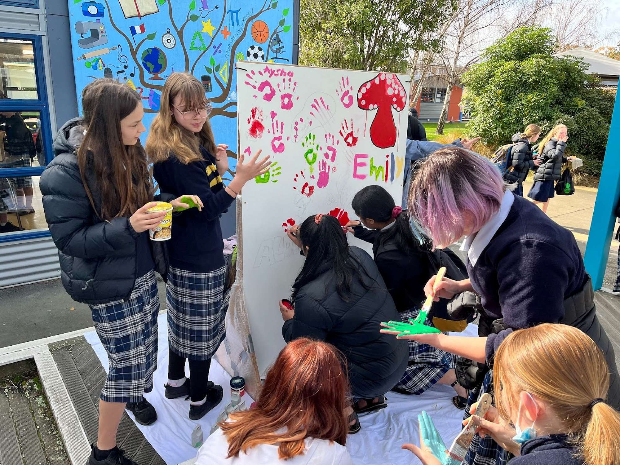 Week 5 was a Hauora / Wellbeing week at MGC. One of the activities was a lunchtime painting on a Wellbeing Wall. It became very popular and we had to extend it by another week. Lots of students enjoyed just hand painting or writing their names; others produced great pictures of flowers, animals, trees, etc. The two sides of the wall are going to be hung up in the C Block.