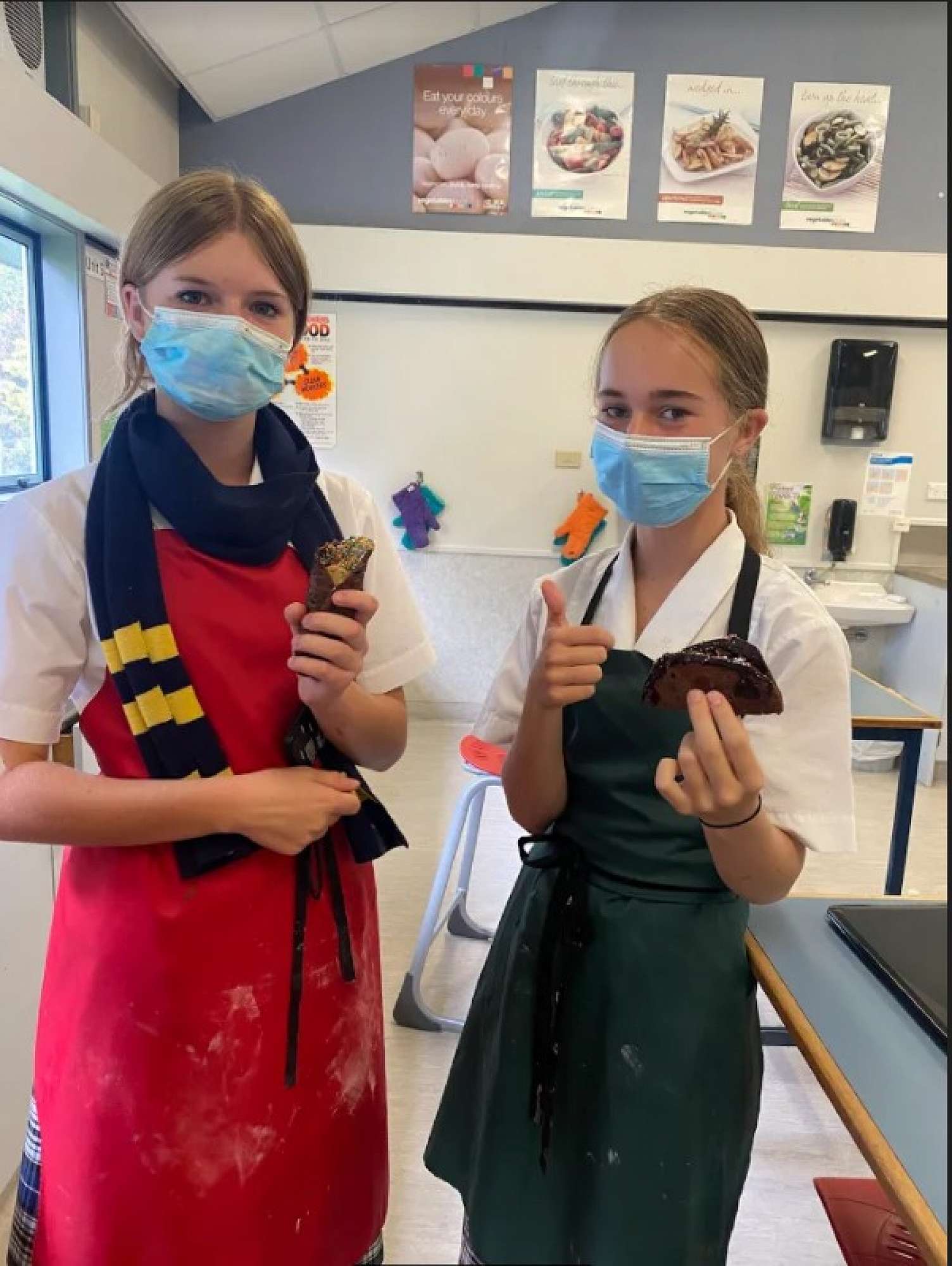 In this picture Isabella Posa and Abbie Boyd are holding the tacos, which they created perfectly with ratio and adding the chocolate shell.
