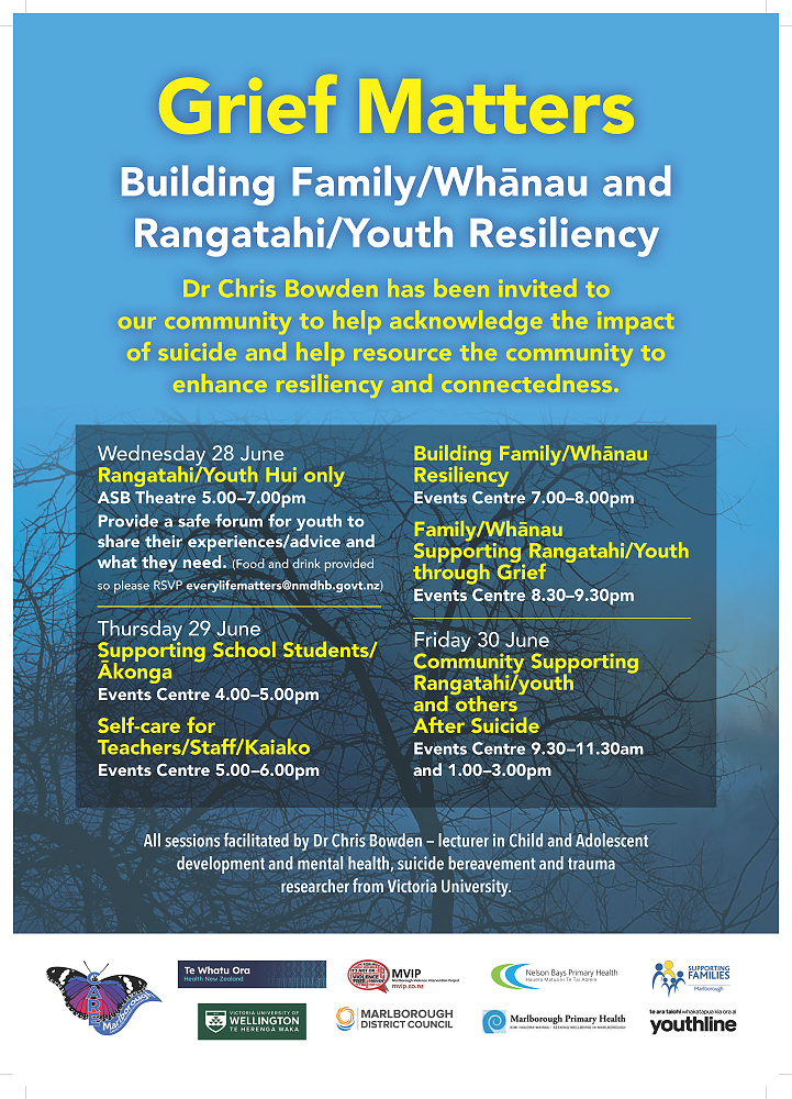 Dr Chris Bowden from the School of Education, Te Herenga Waka/Victoria University of Wellington, has been invited to our community to help acknowledge the impact of suicide and help resource the community to enhance resiliency and connectedness. Dr Bowden is a Lecturer in child and adolescent development and mental health, suicide bereavement and trauma researcher and will be presenting a number of workshops.
