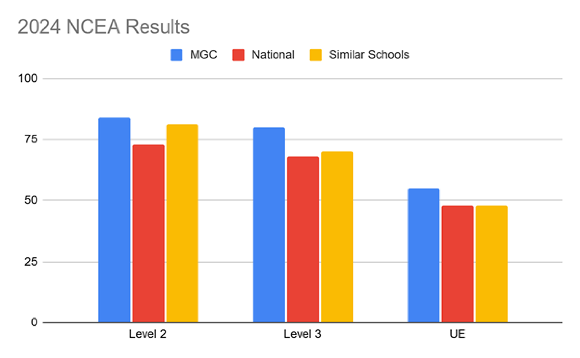 MGC's NCEA and UE results continue to be well above the national average and above the results for other schools like us. We are really proud that NCEA results for MGC Māori students also improved in the last year with their results being comparable with all MGC students. NCEA and UE results for Māori students at MGC are well above the national pass rate for Māori students. MGC's Literacy and Numeracy pass rates for the new co-requisites are also above the national averages.