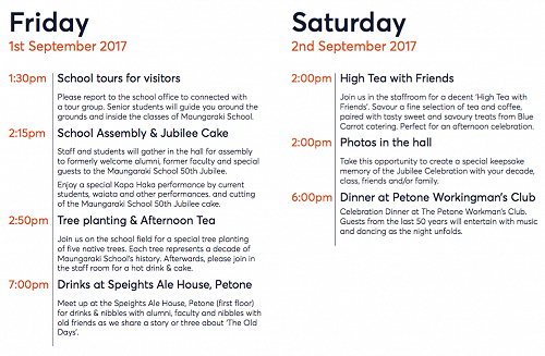 Some of the planned events over the two day are a Special Jubilee Assembly, Tours of the School, Drinks and Nibbles, A High Tea and an Official dinner.