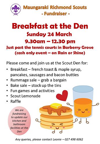 The Maungaraki Richmond Scouts will have their annual 'Breakfast at the Den' event.