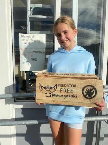 The Enviro team was lucky to have Emily Mossman from Predator Free Maungaraki in to demonstrate the Doc 200 trap. These traps are important for the trapping programme as they can catch the larger mustelids as well as rats. The Enviro team learnt about how to set the victor traps and how to keep their fingers safe. We had a demonstration of the Doc 200 trap and it was loud! Backyard trapping is important as it removes and reduces the amount of pests that prey on our native birds, lizards and their food sources. Our Enviro team has purchased some new T-Rex traps to use in our trap tunnels. Emily has added the new Predator Free Maungaraki logos to our tunnels, and reminders to keep fingers away from our traps!
