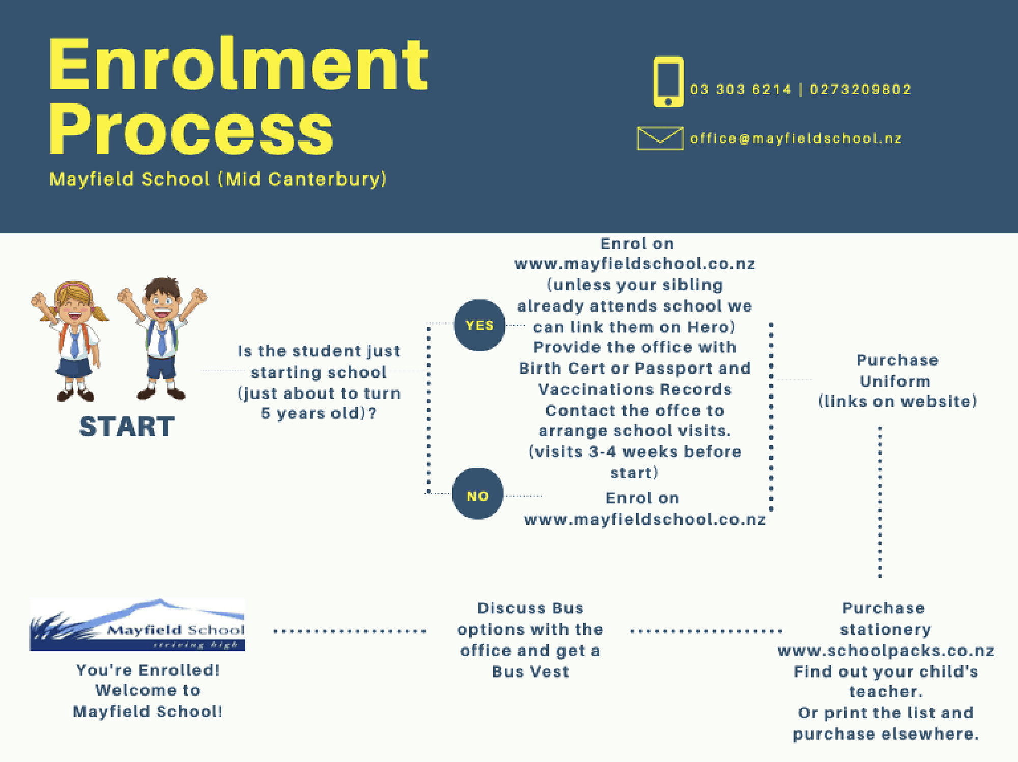 Please follow the flow chart below. Click on the enrolment link to enrol online. If you have any questions, please contact the office.