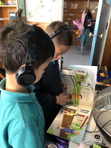 This can be in the form of talking, drawing, writing, playing memory or other games, and reading. Classrooms are usually humming with busyness as children choose who they want to learn with and what task is appealing to them. In the photo above, Sulaiman and Kartel are enjoying listening to a story in te reo Māori and following along with the book.