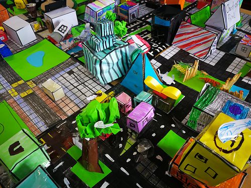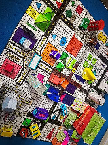 After reviewing prior knowledge and learning new geometric terms, students had to pass a mapping 'test' in order to gain a building permit. Next, it was time to plan our city districts in 2D. Building up was the fun part; we created 3D buildings of all shapes and sizes. Finally, we assessed our own and others' districts and voted for the most attractive and desirable city features, solid constructions and appropriate layouts.
