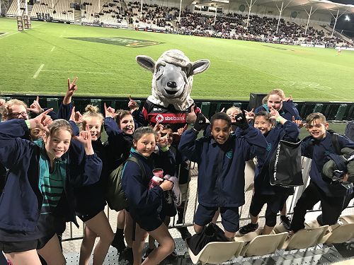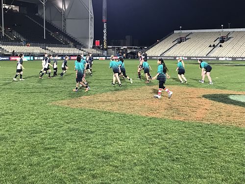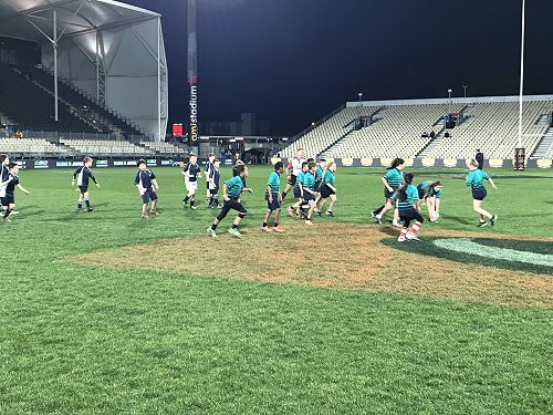 Before the main game started we played a Rapid Rugby game against St Patricks. It was a great game played with a lot of fun! After the game, we were given the opportunity to form a guard of honour for both teams to run through. When we were clapping the player's hands. Once the players were on the field we went up in the stands and watched the first half of the game before competing in a rugby passing relay at half-time. We had to line up and pass the ball down the line from one end of the field to the other. Once we got to the other end we ran back to do it again. The first team to go there and back twice was the winner and they got a $500 voucher worth of sports gear. We won! After that, we went back and watched the rest of the game. During the game, there was a challenge for everyone that if a player kicked the ball into the crowd and you caught it you would win a prize. Suddenly, Blake caught the ball and he won a voucher to Burger King! It was such a great experience for us all and we would like to thank our parents for taking us to the game and the Canterbury Rugby Union for the wonderful opportunity. Thank you to Maika, our manager on the day and Matua for organising the opportunity.