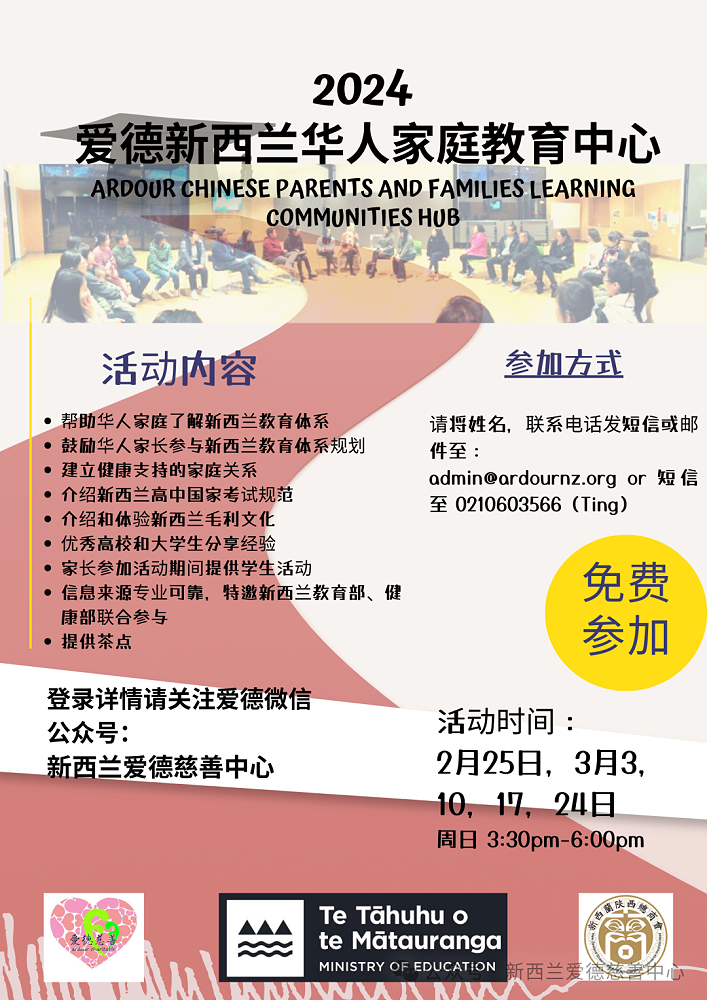 Ardour Charitable Trust, in collaboration with the Ministry of Education, invite Chinese families to the education learning community hub to understand the New Zealand education system.