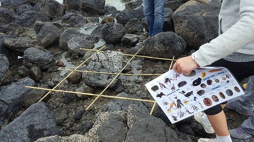The venue was Cass Bay and an overcast day greeted us as we assembled on the shore. Seven Merrin 'citizen-science families' gathered just before low tide ready to find a suitable rockpool to survey. Armed with their Marine Metre Squares (hence MM2), Rocky Shore Guides, recording sheets and keen eyes they headed off in search of creatures and plants that inhabit this wild place and that live in that fascinating space between the high and low water marks. The data we were gathering would be uploaded to the NZ Marine Study Centre at Otago University so we started by recording the GPS position and then identifying and writing down all the different seaweeds and animals that were living in our square. It was amazing how many things are living in and around the rockpools - and the more you look the more you find. Our tamariki learned the best places to carefully look so that the animals remained safe. We all became excited when we found crabs and anenomes and chitons, our 'Sherlock' skills came into play as we then had to work out just which creature we had found. We found so much living in these small areas; Neptune's neckless, sponges whelks, tubeworms, starfish and millions of barnacles just to name a few - check out the Rocky Shore Guide with the ling at the end of this article. Amazing!