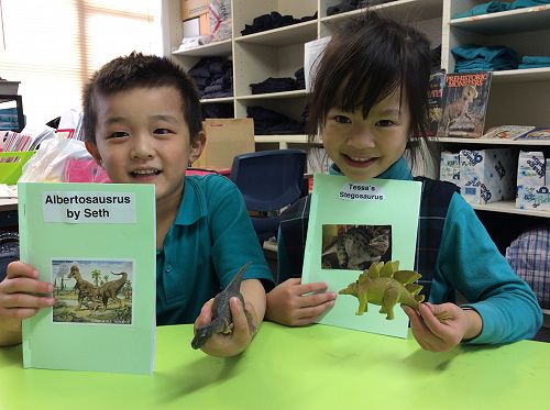 The students showed a huge interest in the dinosaur pictures and so they all chose one dinosaur to write about. The students wrote an Information Report which they shared with their class. The picture above shows Tessa, Seth, Mia and Junie looking at the dinosaur models that Tessa had brought to school. Below, Seth and Tessa proudly show their books they have written about their chosen Dinosaur.