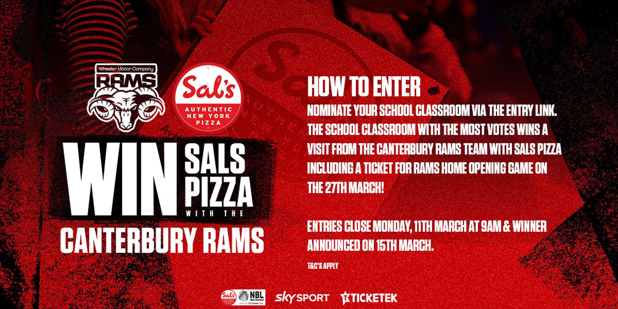 Win Sal’s Pizza and a visit from the Canterbury Rams to your classroom!!The classroom with the MOST votes will win Sal’s Pizza delivered by the Canterbury Rams straight to their classroom one lunchtime the week of March 18th. The winning classroom will also receive tickets to attend the Rams’ first game of the season against the Nelson Giants, where we will be raising our 2023 championship banner!The winners will be announced on Friday, March 15th at 12:00pm.