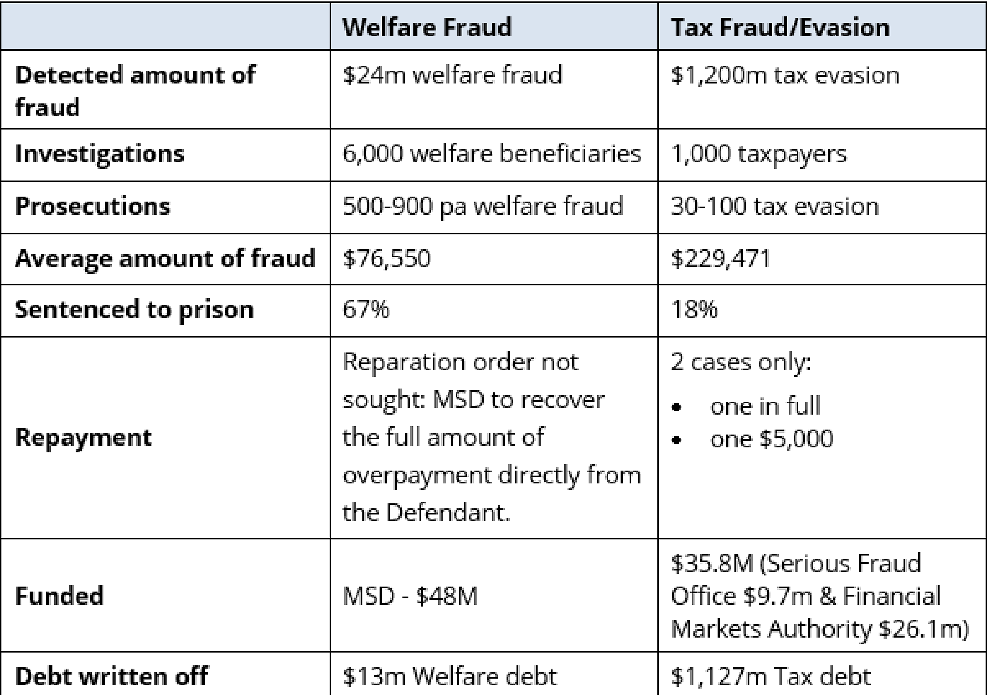 Wealth is only one end of the income spectrum, with poverty at the other. To get a fuller picture of economic justice, we also need to take into account the criminalisation of poverty in our country. Lisa Marriot, Professor of Taxation at Victoria University of Wellington, explains the difference between how welfare fraud is treated more harshly than tax evasion.[4]