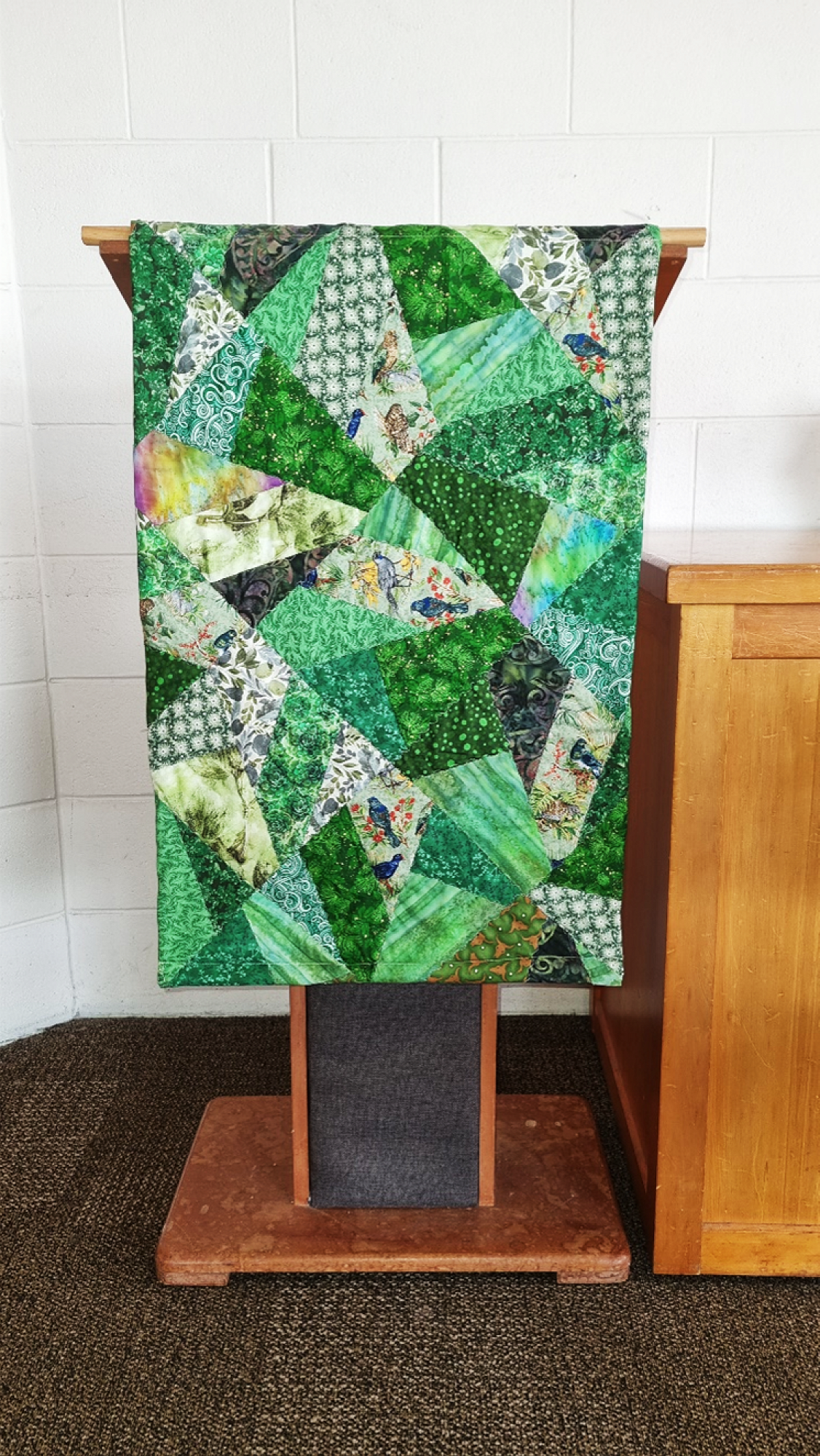 The design I chose is crazy patchwork. Not the traditional crazy quilt but using five templates so there is order although it isn’t obvious. Each piece is sewn to the next one forming a block, then sewn together to form the whole. Each piece plays a part in bringing the overall design to life. It isn’t random, it is carefully pieced to appear random.