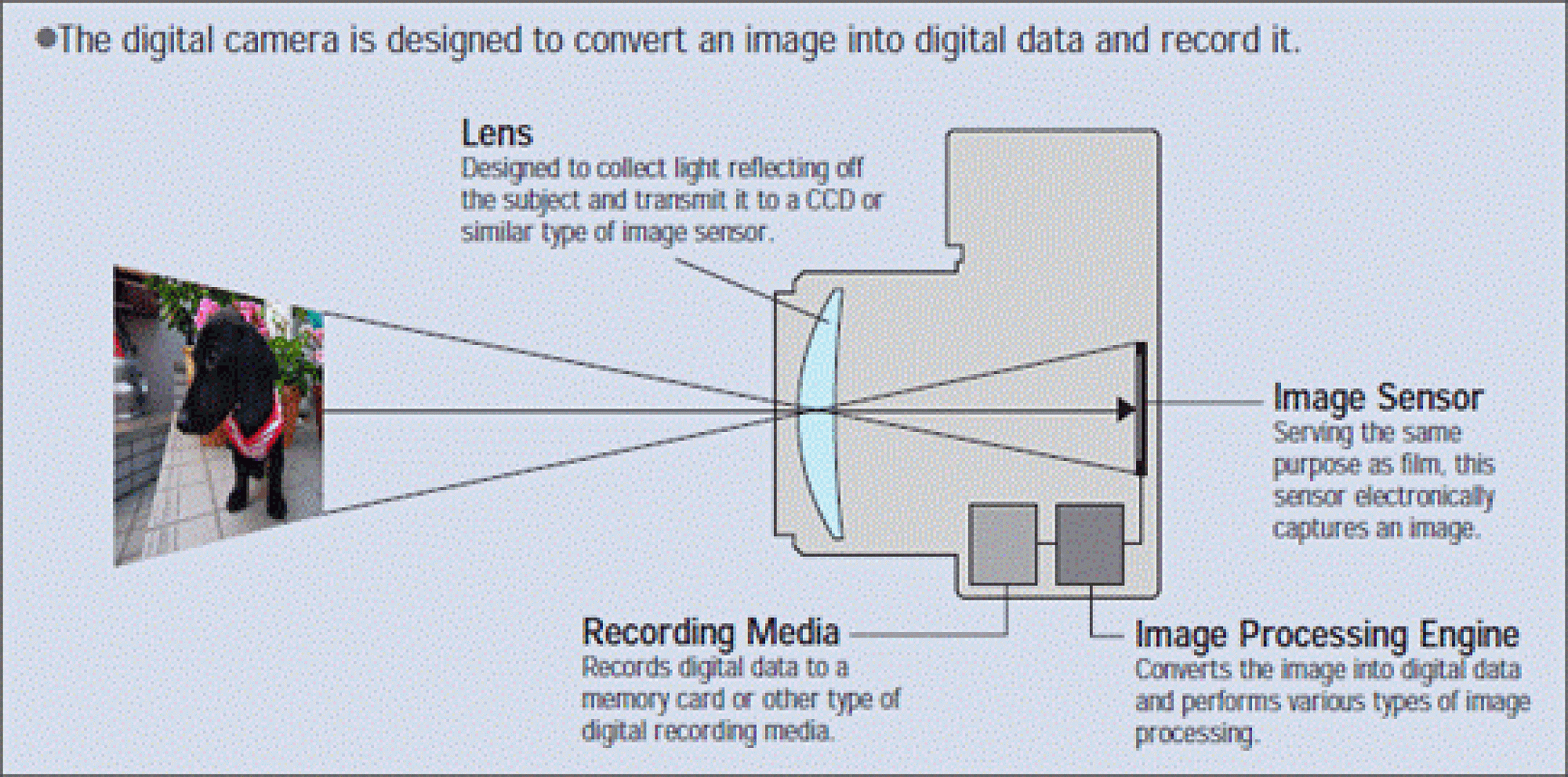 At its simplest, a camera is a device that controls the admission of light into a hole in a box, to illuminate a sensor/recording device. We enhance this by adding lenses and other modifying devices to give us more control over the image produced. With a digital camera, the light entering through the lens strikes an image sensor. The signal output by the image sensor is processed within the camera to create image data, which is stored in a memory. For motion, multiple images are compiled into a video stream and transmitted or stored.
