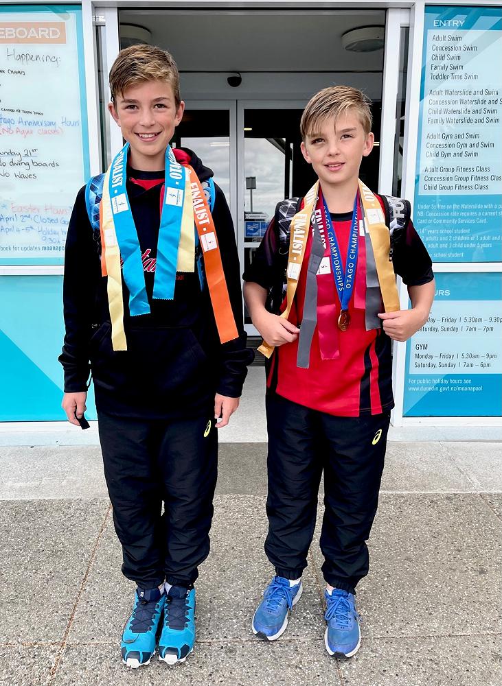 Tristan Gerber (Year 8) and Keegan Gerber (Year 7) qualified for the Otago Junior LC Championships swimming competition that was held in Dunedin 21-21 March 2021. They both made it to finals for all their races (and PB’s in most) with Keegan’s best being 3rd place in 200m freestyle and Tristan 5th place in 100m breaststroke. Keegan's black eye is from an accident during PE at school just a few days prior to the competition!