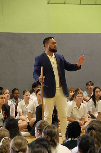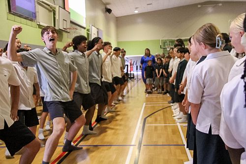 New students and staff were welcomed with a Mihi Whakatau in the School Gym, which involved our school Kapa Haka group performing our school Haka, then Matua Pairama led the welcome in te reo maori on behalf of the tangata whenua (hosts).  Mr Aidan Baker, one of our new staff responded to the welcome as a representative of the manuhiri (new staff and students).  Several waiata (songs) were sung to support the speeches, and a concluding hongi (nose-to-nose greeting), with the hosts initiating the process by inviting the visitors to come forward for the greeting.