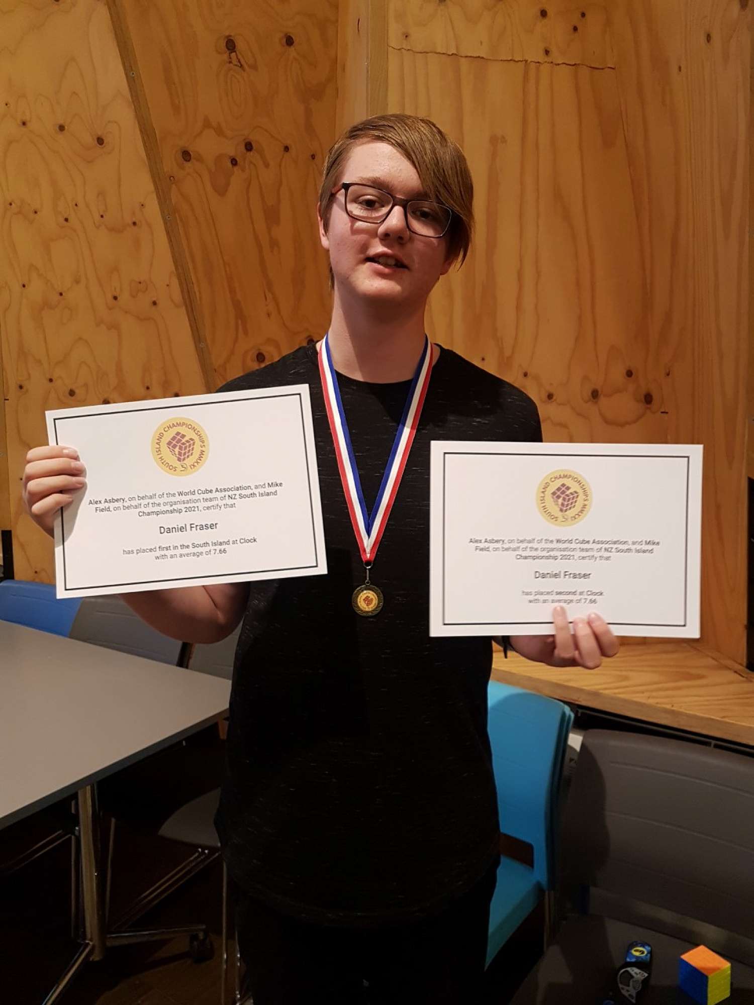 Daniel Fraser, Y11 competed in the South Island Championships for Speedcubing recently. He placed first in the South Island for 'Clock" and second in NZ. He also beat his previous National record from the last competition by officially solving 'Clock' at 5.929 seconds in a single solve.