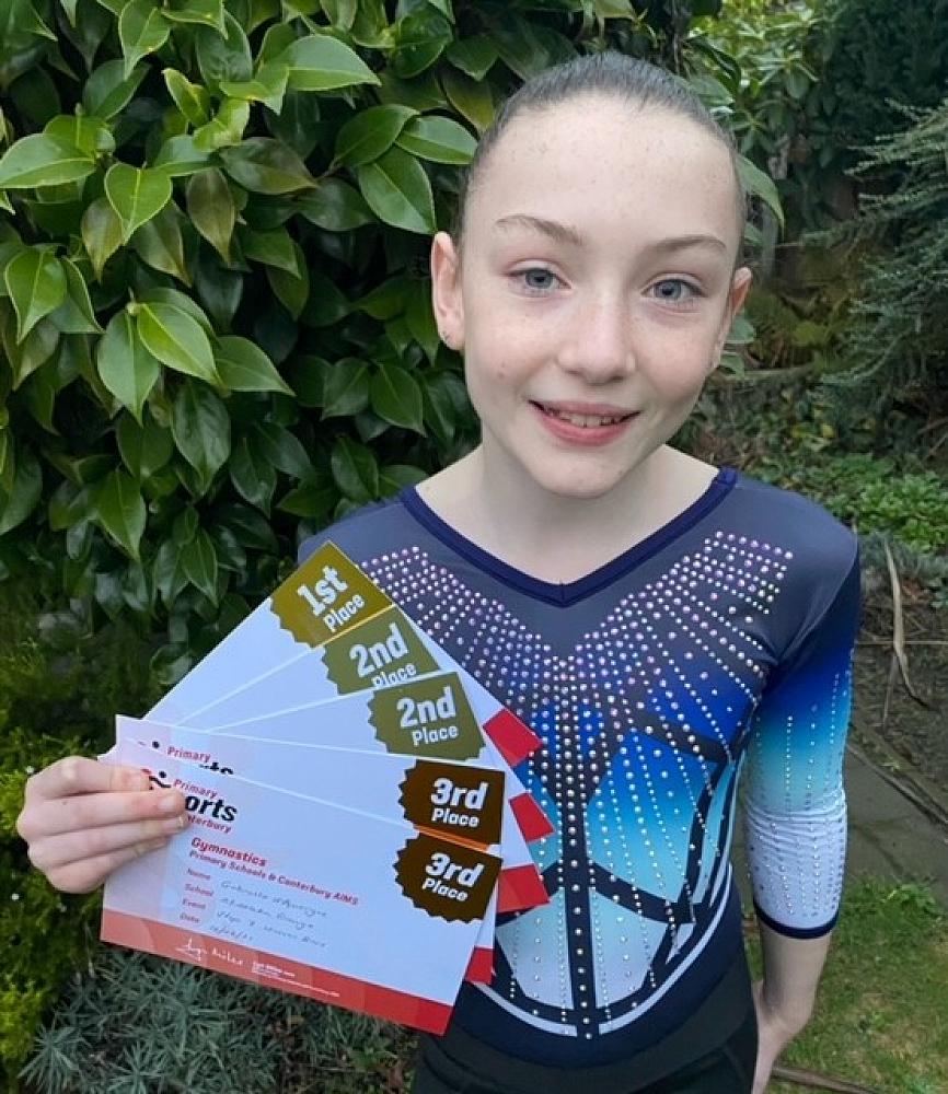 Gabriella D'Auvergne recently competed in the Primary School Sport Canterbury Gymnastics competition and placed 1st in vault, 2nd on beam, 2= on floor, 3rd on bars and then 3rd overall, which is an awesome result.
