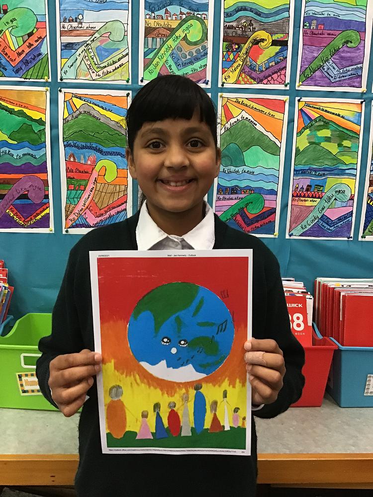 Jeni Nadarajah from Room 13 is the winner of the 2021 Christchurch School’s Music Festival Poster Competition. She is holding a photocopy of her winning poster. It will be used to advertise the music festival, as well as on the programme. She has won $100 for herself, and for the school.